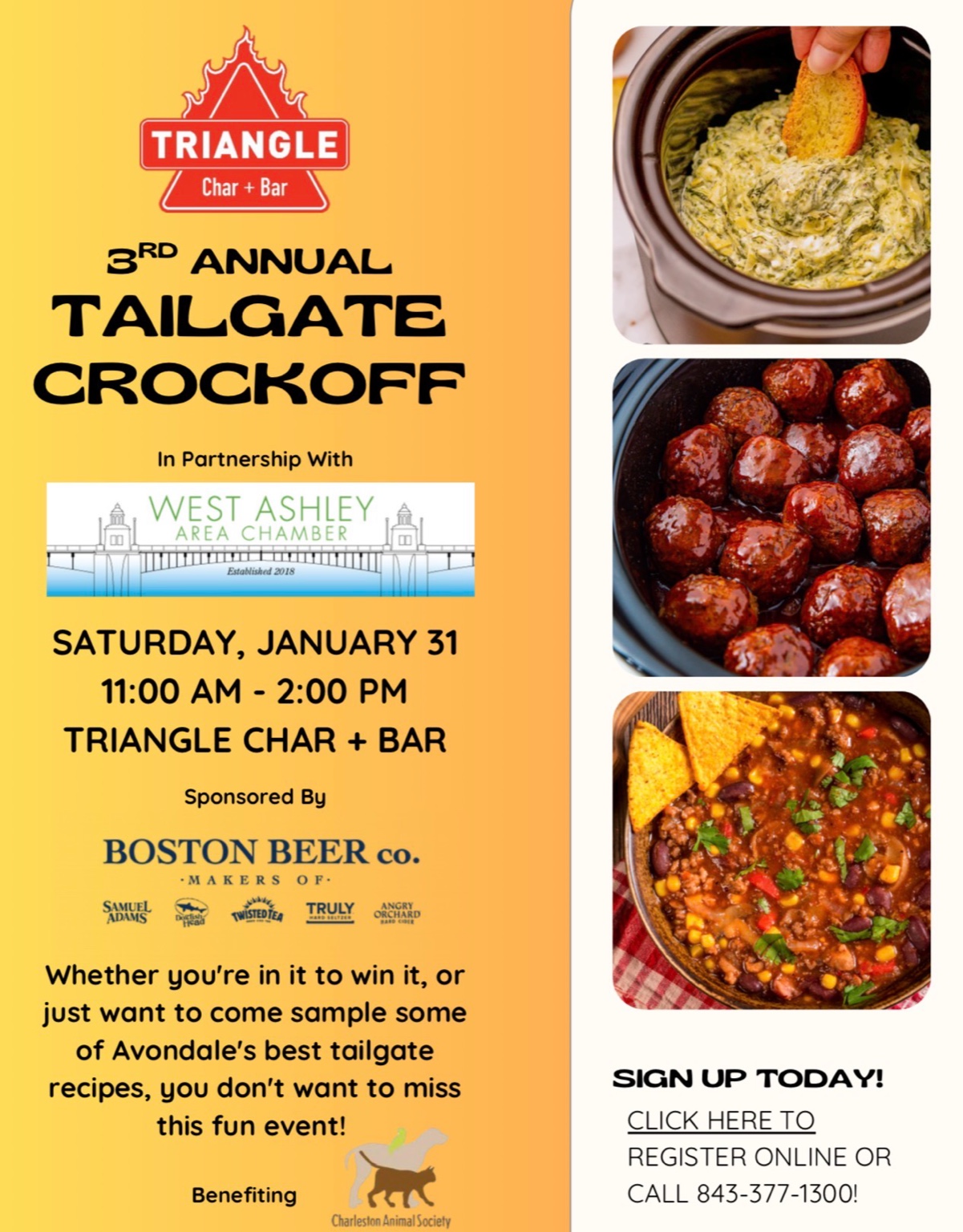 Get ready for one of West Ashley’s most fun and flavorful winter events! Triangle Char + Bar, in partnership with the West Ashley Area Chamber of Commerce, invites you to the 3rd Annual Tailgate Crock-Off, proudly sponsored by Boston Beer Company and benefiting the Charleston Animal Society.